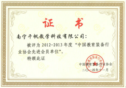熱烈慶祝南寧千帆榮獲“2012-2013年度-中國教育裝備行業(yè)協(xié)會(huì)先進(jìn)會(huì)員單位”稱號(hào)