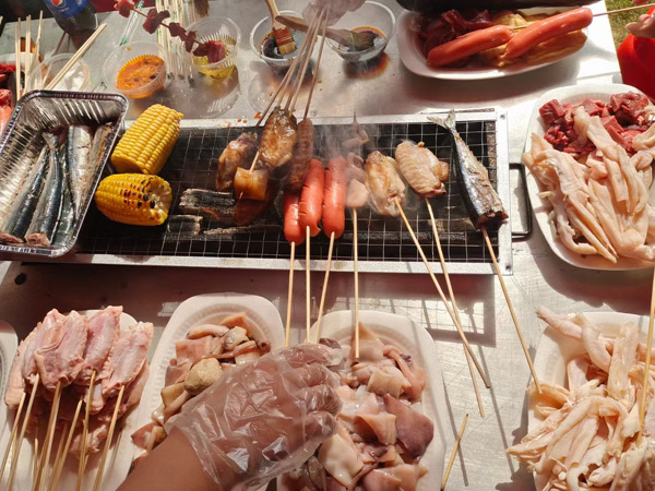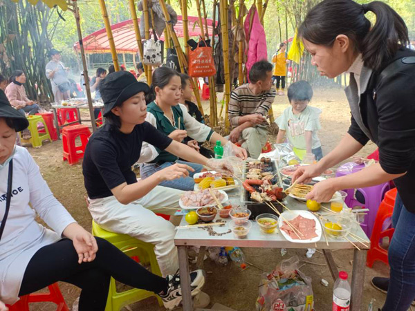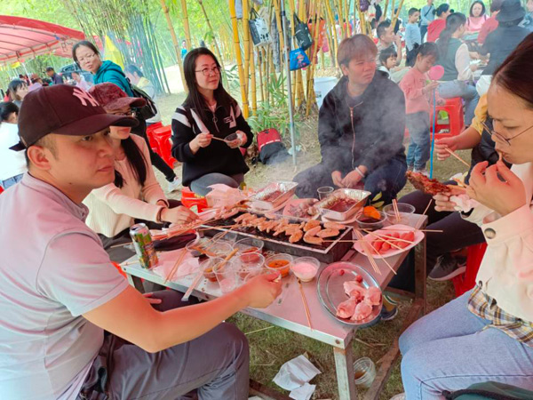 11:30體育運(yùn)動(dòng)結(jié)束后,大家來到燒烤場(chǎng)進(jìn)行自助燒烤。燒烤場(chǎng)座落在綠蔭濃濃的竹林中,雖是冬日,卻煦日暖暖,溫和的陽光打在竹葉上,落下斑駁的日影,清風(fēng)襲來,沁人心肺。燒烤場(chǎng)里飄香四溢的烤全羊、外酥里嫩的烤香豬、肥肥的雞腿、嫩嫩的雞翅、勁頭十足的牛肉丸,還有火腿、茄子、玉米、青椒等早已備好,此時(shí)大家早已饑腸轆轆,便迫不急待地動(dòng)起手來,“自力更生”,喂飽自己的肚子! 大家團(tuán)坐在烤爐旁,你遞個(gè)調(diào)料,我刷下辣醬,互幫互助,默契盡在不言中,其實(shí),這也是一種心靈的溝通與交流。